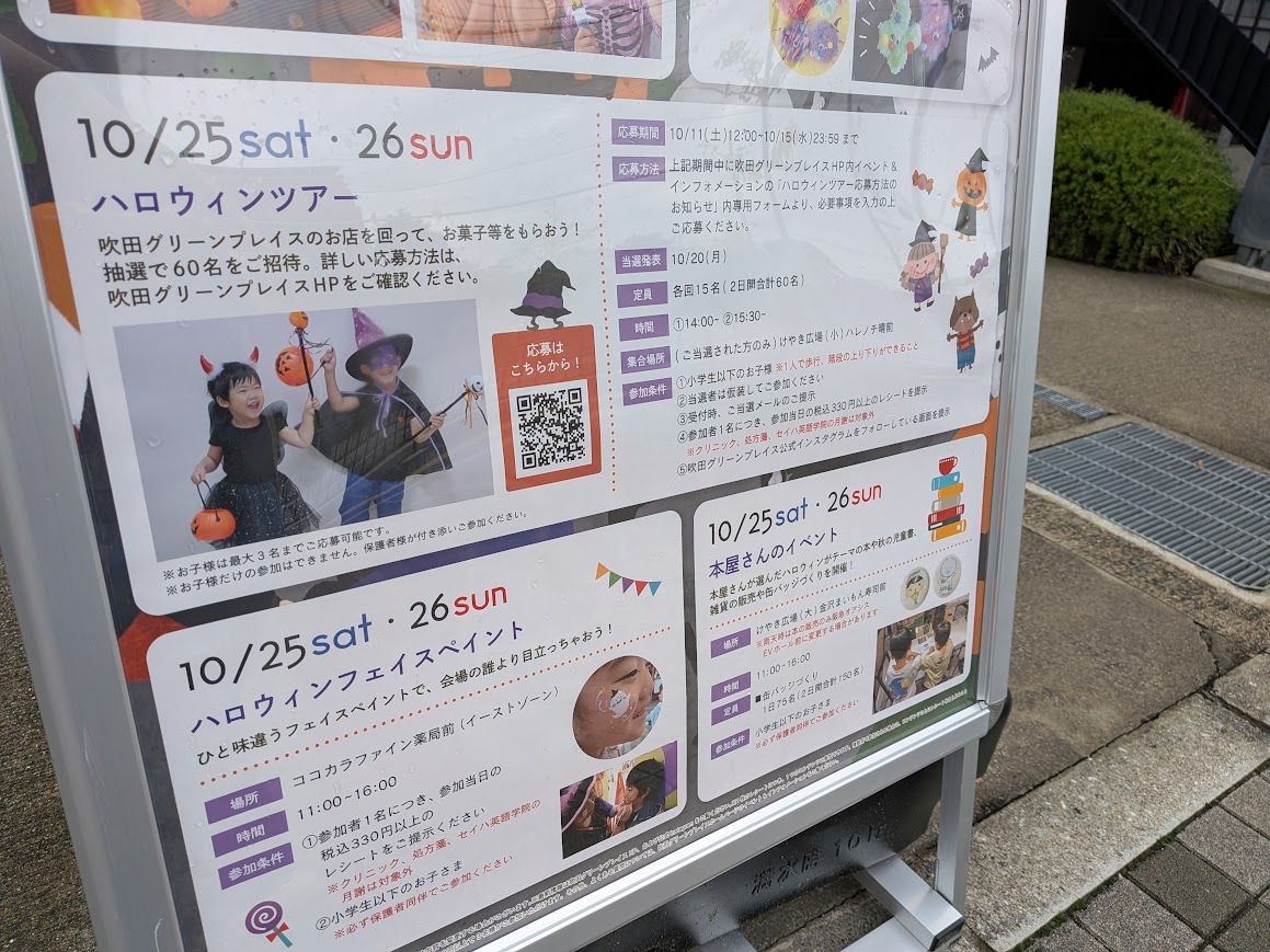片山町の吹田グリーンプレイスでは、子どもから大人まで参加できる「ハロウィンフェスタ」が 2025年10月18日(土)〜10月26日(日) に開催されますよ~。