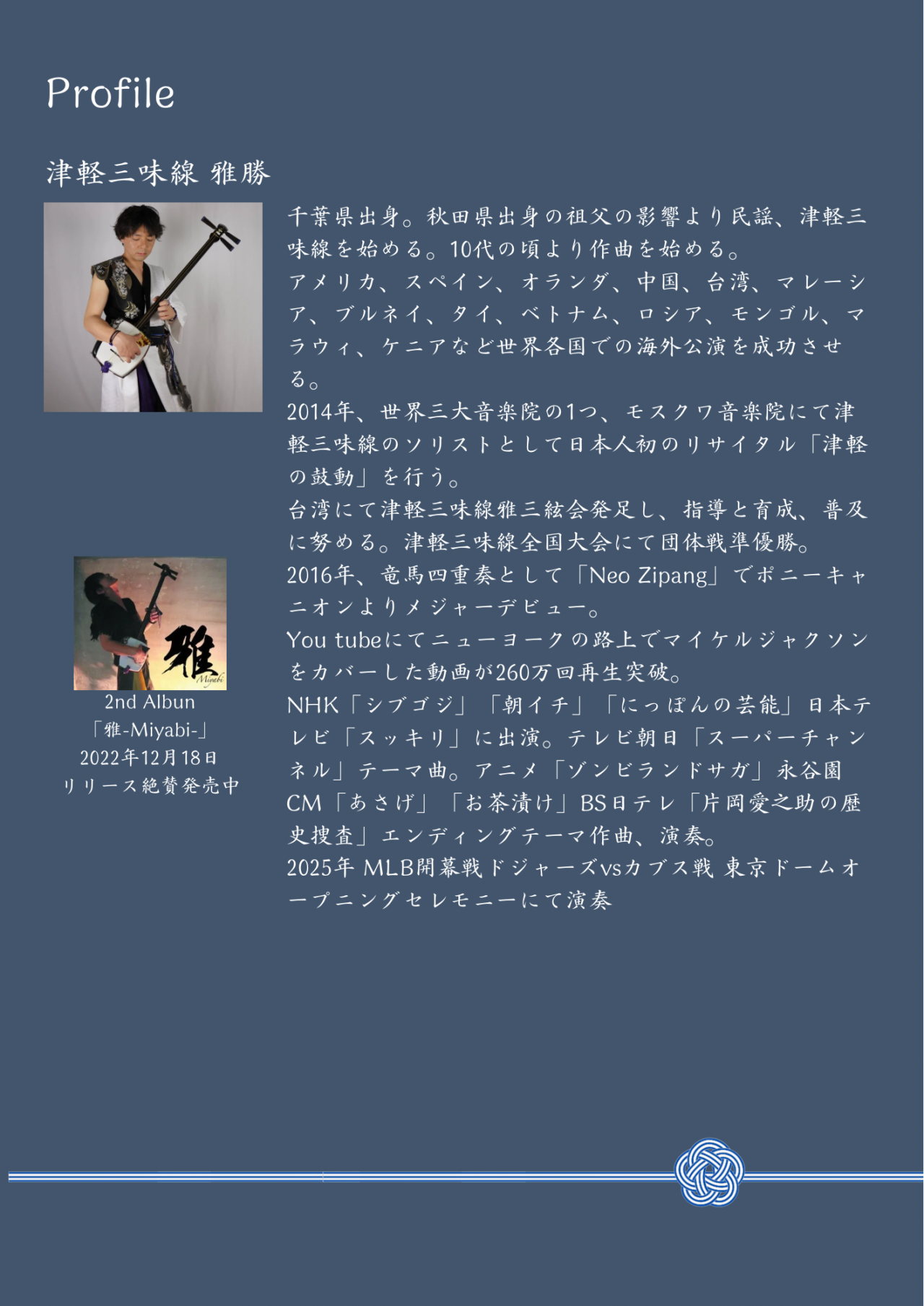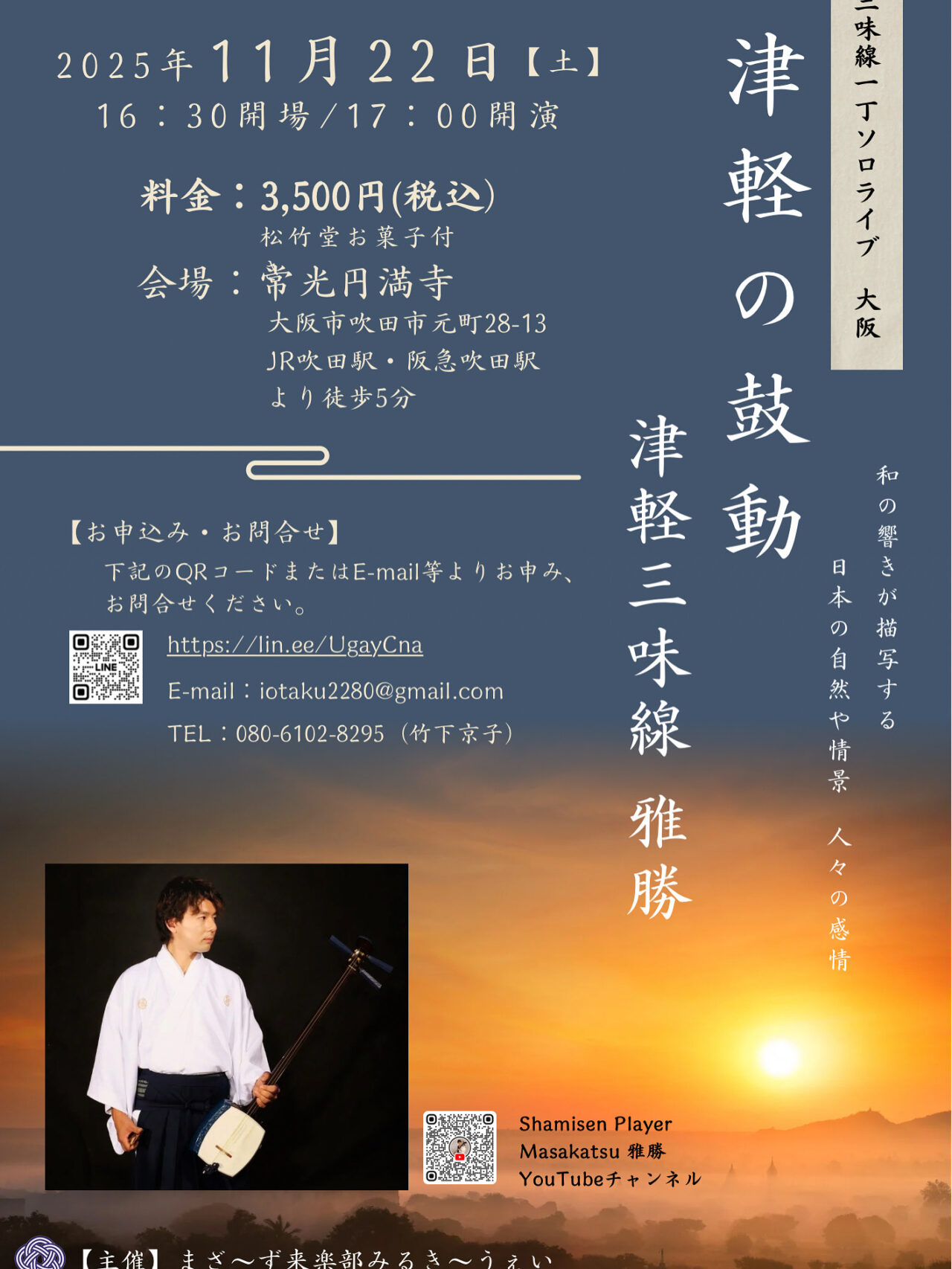 伝統楽器とロックが融合するユニット「竜馬四重奏」の津軽三味線奏者、雅勝さんのソロライブが、2025年11月22日(土)17時から吹田市元町にある「常光円満寺」で開催されます♪
