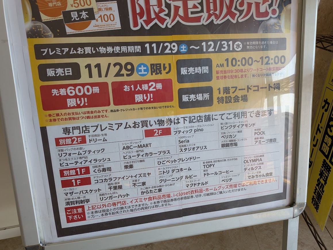 イズミヤショッピングセンター千里丘では、「専門店プレミアムお買い物券」の販売が実施されることがわかりました!