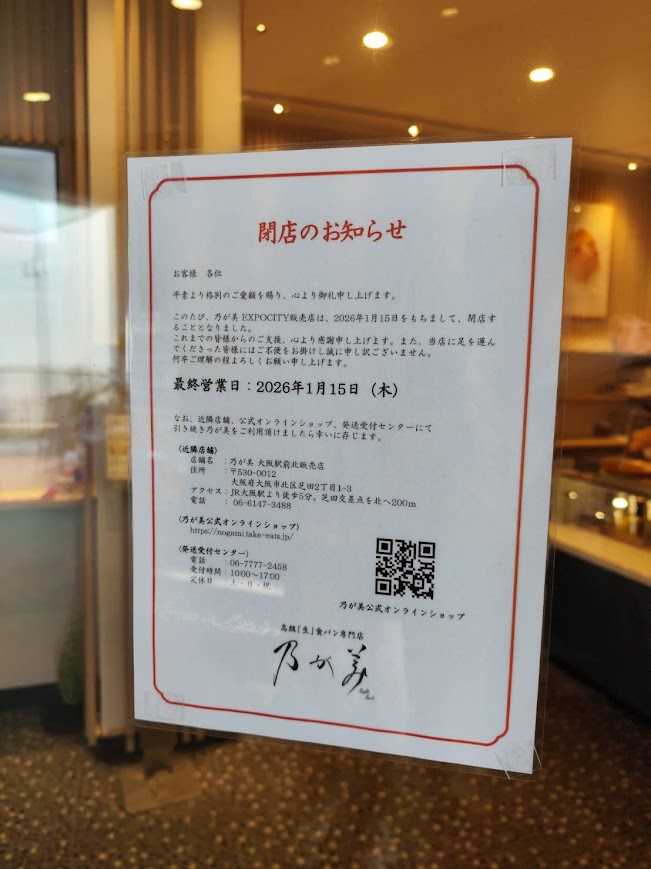 【吹田市】ショック。エキスポシティの高級食パン専門店「乃が美」が突然の閉店へ。