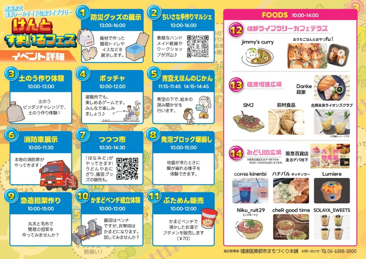 健都ライブラリー内や公園の芝生広場では、吹田にゆかりのあるワークショップや健康・スポーツ体験、地元団体のパフォーマンスなどが予定されています。