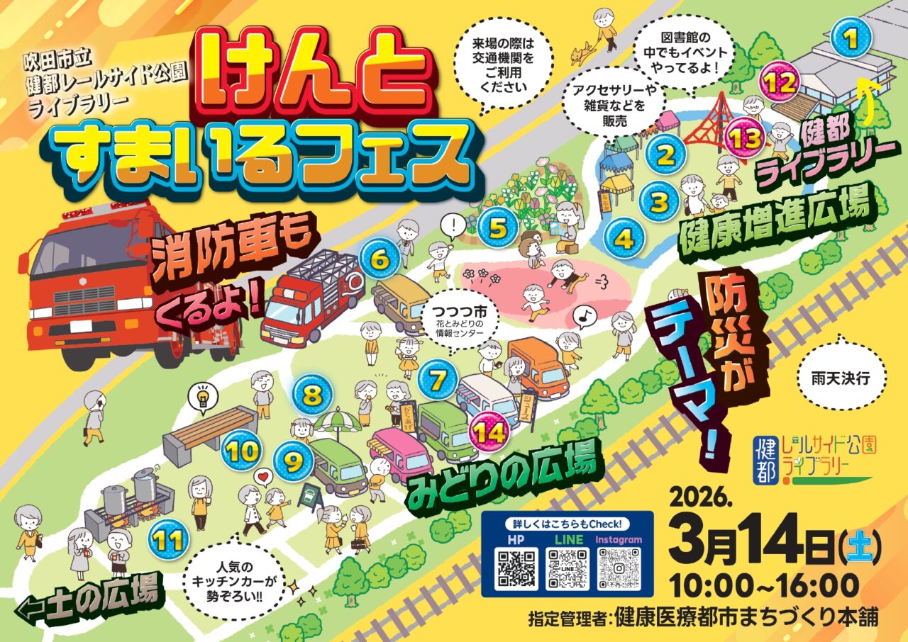 吹田市岸部新町の健都レールサイド公園(ライブラリー前)にて、2026年3月14日(土)、地域交流イベント「けんとすまいるフェス」が開催されます♪