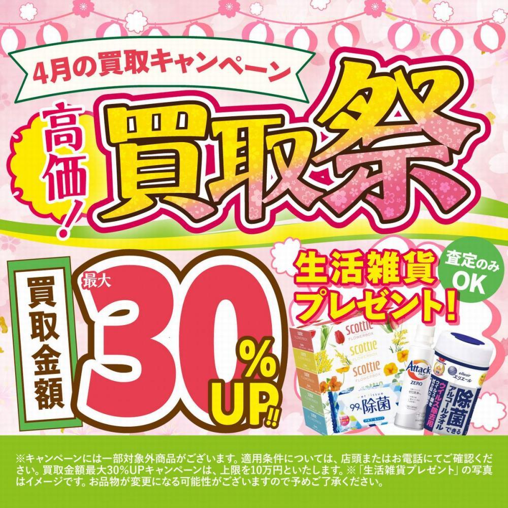 ※キャンペーンには一部対象外商品があり、適用条件の確認が必要です。買取金額最大30%アップの上乗せ上限は10万円とのこと。詳細は店頭またはお電話にてご確認ください。
