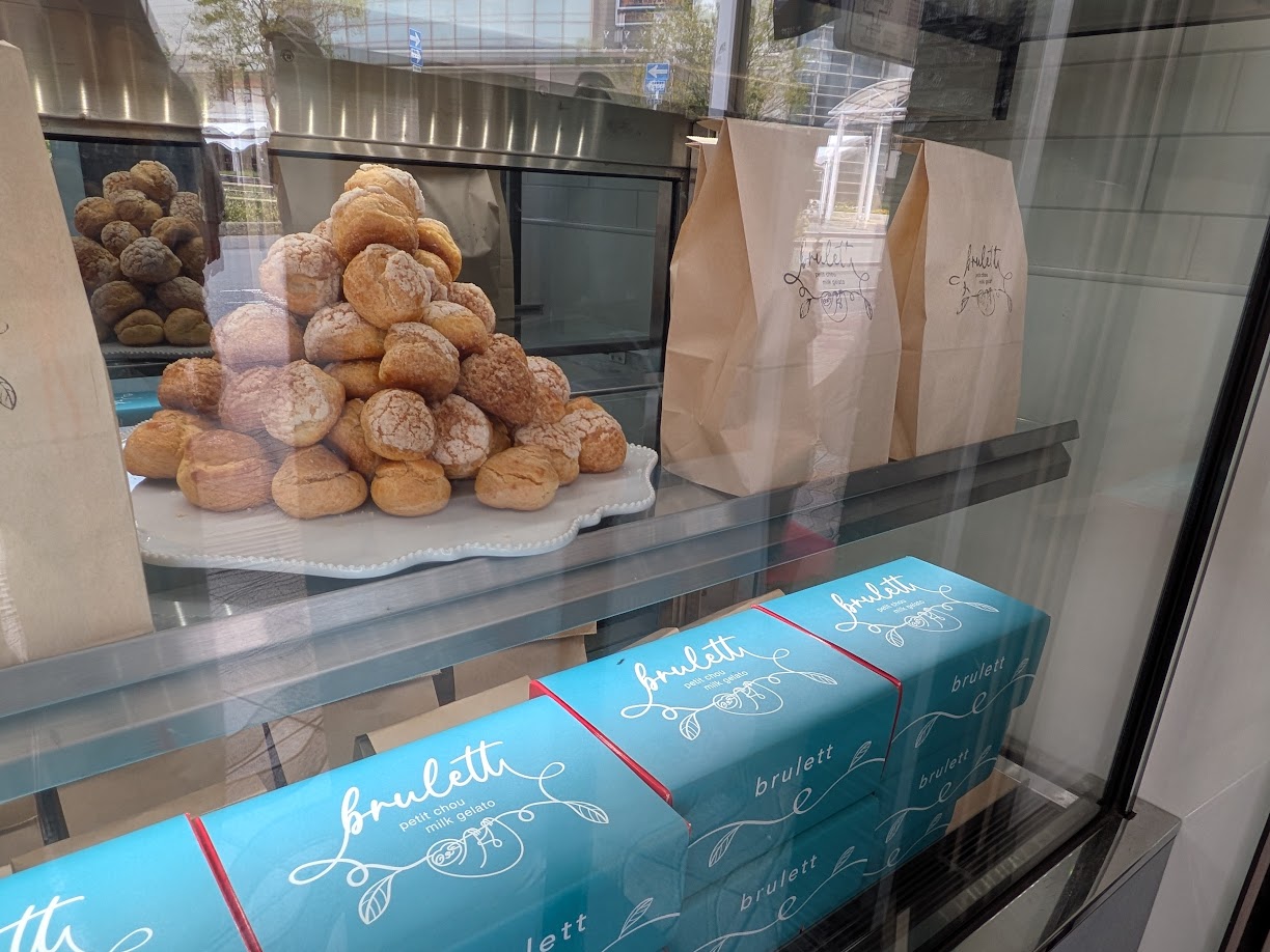 brulettは、神戸北野ホテル出身のシェフパティシエが監修したスイーツ店で、焼きたてのプチシュークリームと、牛乳にこだわったミルクジェラートが看板商品。