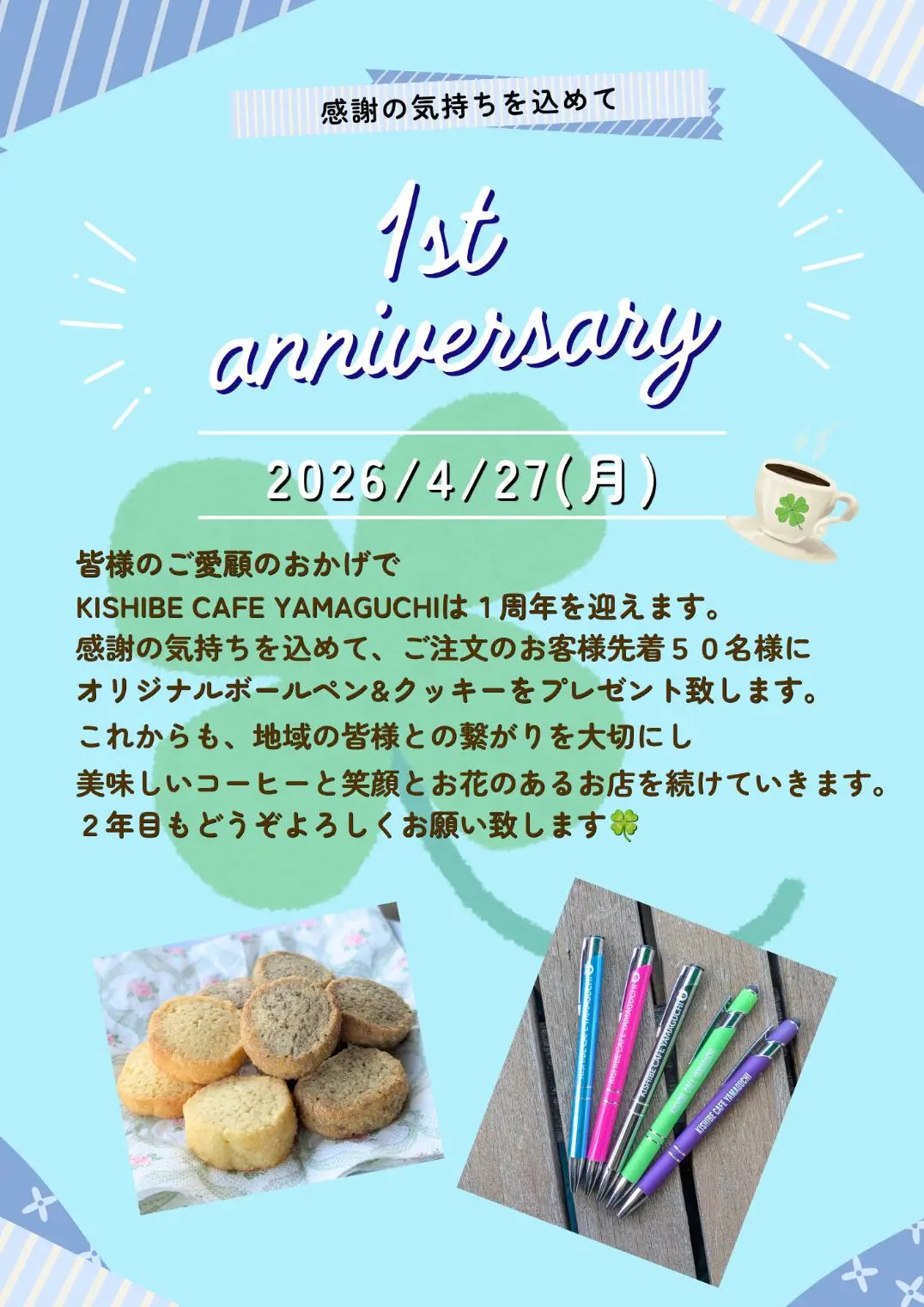 【吹田市】「KISHIBE CAFE YAMAGUCHI」が本日2026年4月27日に1周年!先着50名にクッキー&オリジナルボールペンをプレゼント♪
